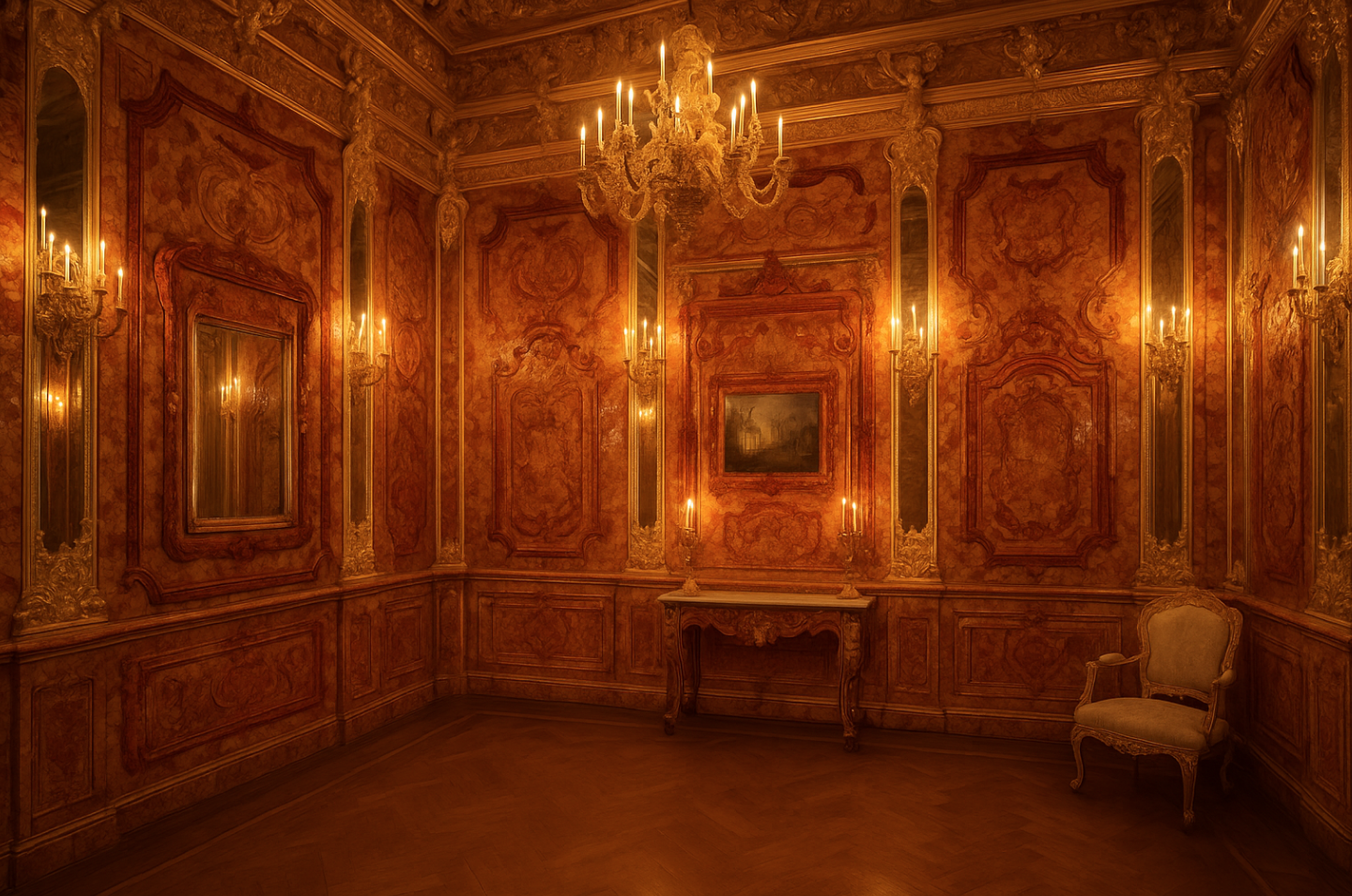 A baroque masterpiece crafted from 13,000 pounds of amber, gold leaf, mirrors, and semiprecious stones…designed not to impress, but to dazzle. Floor to ceiling, wall to wall, it shimmered like the inside of a gemstone, glowing honey-colored with light that seemed to flicker from within.